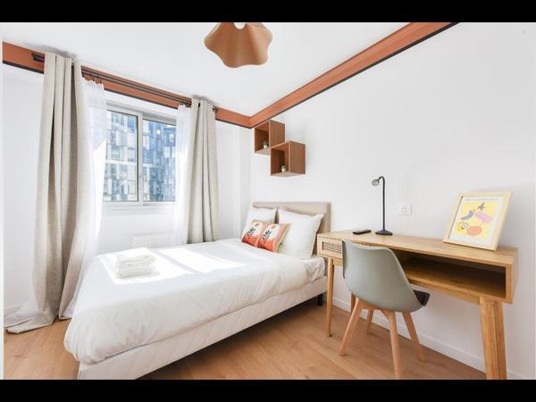 🔒 Confort & intimité • Chambre avec salle d’eau privée + WC • Clé individuelle pour chaque chambre • Lit double, dressing, bureau, mini-frigo, miroir, linge de lit fourni
