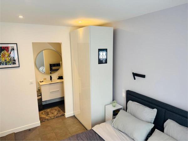 La chambre proposée se trouve au rez de chaussée dispose de sa propre salle d'eau (douche, hammam, et meuble-vasque). D'une surface de 14m² elle est équipée d'un lit double avec TV escamotable, deux chevets , et d'une grande armoire avec tiroir et penderie. Linge de lit et de toilette fournis.
