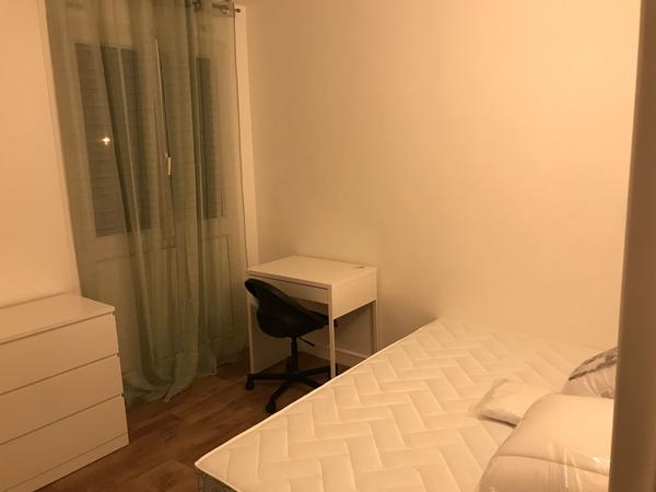 Chambre de 9,50m² disponible avec fenêtre équipée d'un de lit double140x190 (oreillers + couettes + alèse), bureau et siège, dressing. Serrure individuelle. L'appartement est composé : - Salon meublé : canapé, repose pieds, table basse, table à manger et TV - Cuisine équipée : réfrigérateur/congélateur, plaque de cuisson, micro-ondes, four, machine à café, bouilloire, ustensile de cuisine et vaisselle - Salle de bain : lavabo et meuble, cabine de douche, lave-linge, sèche serviette, rangement, table et fer à repasser - WC indépendant - Entrée : grand rangement et penderie, aspirateur...
