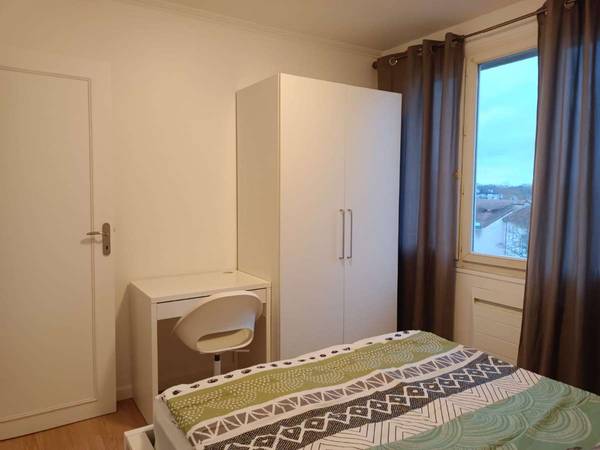 🏡 Description de l’appartement L’appartement se compose de : 3 chambres privatives (toutes équipées d’un lit double, bureau, chaise et dressing – visibles sur les photos) Une salle de bain récente avec douche moderne et machine à laver Un WC indépendant Une cuisine équipée avec espace repas (réfrigérateur, four, plaques, micro-ondes, machine à café, nombreux rangements)
