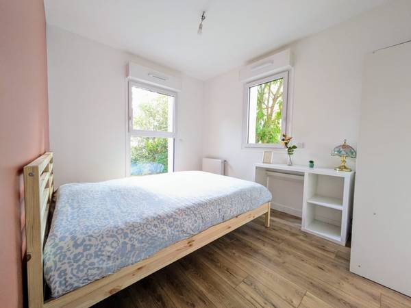 Cette chambre est équipée d'un lit double, d'un placard de rangement spacieux et d'un bureau, créant ainsi un environnement confortable et pratique.