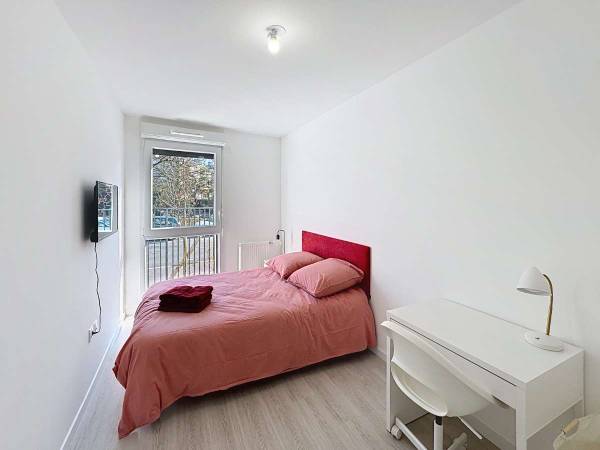Elle est entièrement meublée avec goût et confort : lit 2 places (literie de qualité), table et lampe de chevet, placard de rangement avec penderie, bureau de travail et télévision.