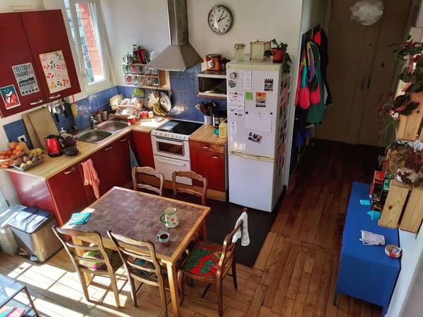 Il est situé dans la rue Marc Seguin dans le 18e (métro Marx Dormoy), au 5e étage sans ascenseur (promis on s'y habitue). L’appart est vraiment bien, il fait 68m2 (surface carrez) et 78m2 au sol (une chambre sous les combles). Il est meublé, il y a tout ce qu’il faut. Il y a une machine à laver, une cuisine équipée... Il y a même un balcon donnant sur 3 des chambres du bas. La chambre qui se libère fait environ 15m2 et elle est meublée d'un lit double. Elle est située sous les combles. (voir l'escalier dans les photos) Avec un accès direct à une salle de bain.