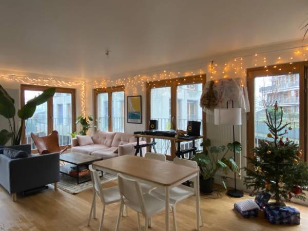Côté appart, il est très bien isolé (top en été comme en hiver) et ta future chambre est bien optimisée. Elle comporte un lit double et une armoire intégrée avec penderie. Petit bonus : On a un grand salon qui s'ouvre sur une loggia permettant de manger dehors aux beaux jours et des voisins qui nous laissent faire la fête ! 🌞🕺