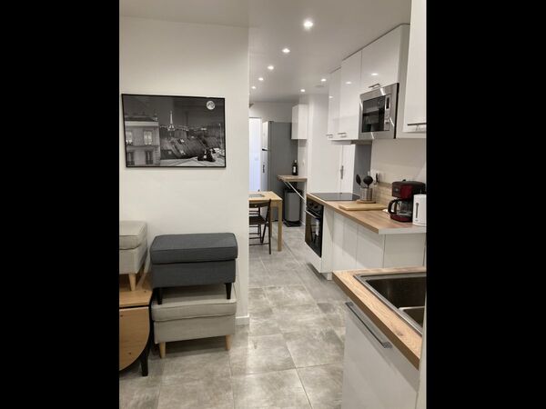 Appartement entièrement rénové,composé de 5 chambres, dont 2 avec douche privative,1 grande,salle de bain avec toilettes,machine à laver et sèche-linge ,un autre toilettes séparé,espace cuisine dînatoire,tout équipée ,coin salon avec canapés et table basse dans une résidence privée avec Jardins,espace vert ,guardien,digicode,local à vélo à 100m du parc des Buttes Chaumont