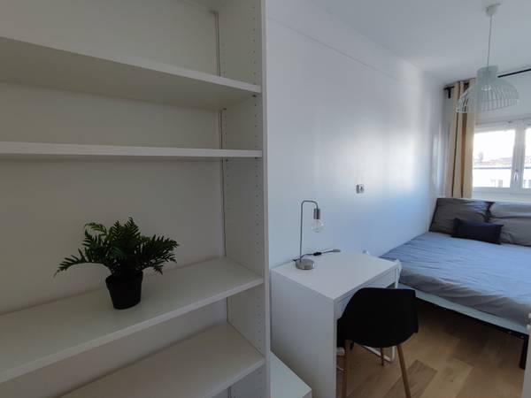 La chambre - Meublée, lumineuse, lit 140x200 cm (avec draps), bureau et rangements - Accès aux pièces communes, internet, chauffage, électricité, eau chaude et assurance inclus dans les charges - Charges comprises, aucune surprise