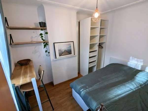 La chambre est meublée avec un lit double de 140 (c'est un lit coffre, bien pratique pour ranger des affaires en dessous), une armoire avec penderie, petit bureau haut et des étagères. Possibilité d'amener ses propres meubles, évidement !