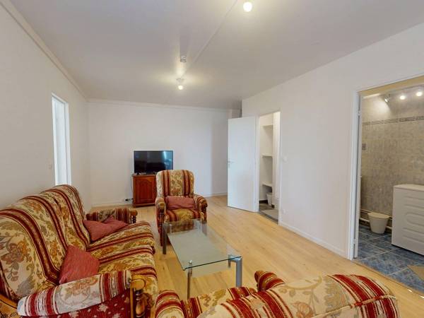 🏠 LES ESPACES COMMUNS La pièce de vie est aménagée avec un canapé, deux fauteuils, une table basse et un meuble télévision avec TV. La cuisine séparée dispose d’un four, d’un micro-ondes, de plaques de cuisson, d’une hotte, d’un évier, d’un réfrigérateur avec compartiment congélateur ainsi que de nombreux rangements et ustensiles de cuisine. La première salle d’eau comprend une douche et un meuble de rangement. La seconde est équipée d’une douche, d’une double vasque avec miroir, d’un lave-linge et de rangements. Les WC sont séparés pour plus de confort.