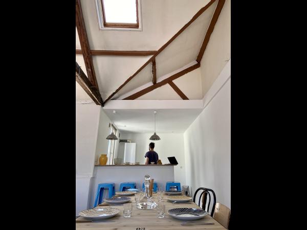 Grand salon cuisine de 35 m2. Coin cuisine équipée avec four, hotte, piano de cuisine, frigo & micro-onde. Coin salon avec grande table, canapé, écran plat 40 pouces.