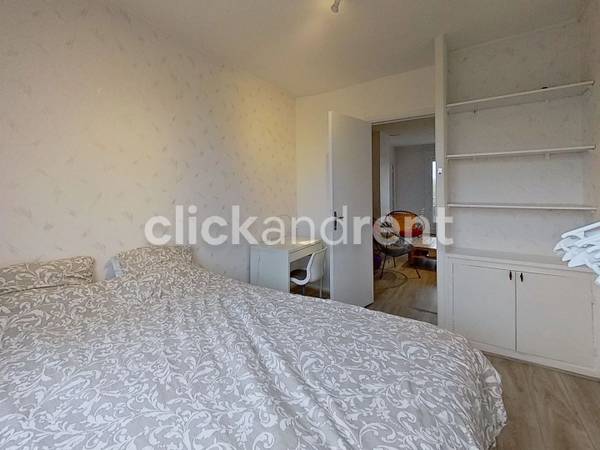 La chambre à louer de 13m² est meublée et équipée d'un lit double, bureau et d'un grand placard.