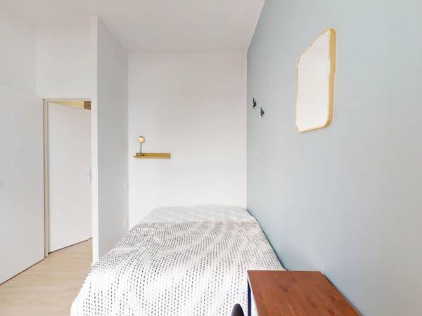 🛏️ LA CHAMBRE Elle est équipée d'un lit (double), bureau, rangements et d'une télévision murale. Elle dispose une salle d'eau privative avec douche et meuble vasque.