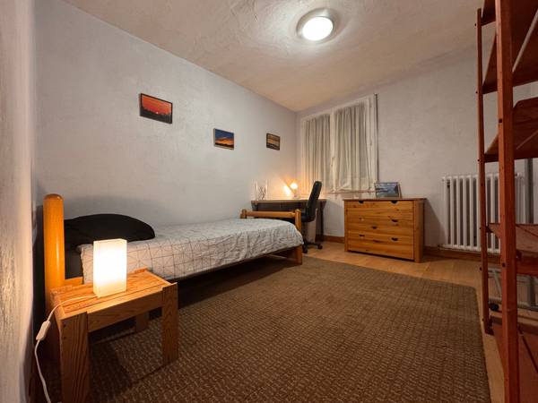 Chambre meublée avec lit simple, matelas et protège matelas.