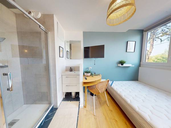 🛏️ LA CHAMBRE 🛏️ Cette chambre dispose d'un lit double, d'une bibliothèque, d'une penderie, d'un bureau avec une lampe et une chaise et une télévision. Elle se compose également de sa salle d'eau privative avec une cabine de douche et un meuble vasque avec un miroir.