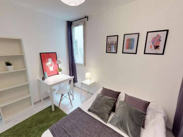 17 Daru - chambre 1 English Version below 🏡 Coloc de 4 chambres - Appartement de 87m² tout équipé Chambre lumineuse et moderne de 11m² avec joli espace de travail 🚇 Tramway 3 - Plan Cabanes Quartier Gambetta - Montpellier 💡 Charges incluses : eau, électricité, internet, assurance… Assistance et maintenance tout au long du séjour si nécessaire 🛏️ 100% meublé et équipé (literie complète, électroménager, bureau, vaisselle…) Visite virtuelle et réservation simple et rapide en ligne 📝 Bail individuel et éligible aux APL (aide CAF) Démarches administratives réduites et durée de location flexible ! 🙌🏻 Futurs colocs : jeunes actifs et étudiants français et internationaux Équipe trilingue disponible pour vous aider dans votre recherche —--------------------------------------------------------------------- 🏡 4-bedroom Roommate - 87m² fully-equipped apartment Bright, modern 11m² bedroom with attractive workspace 🚇 Tramway 3 - Plan Cabanes Gambetta district - Montpellier 💡 Bills included: water, electricity, internet, housing insurance… Assistance and maintenance throughout your stay if necessary 🛏️ Fully furnished and equipped (bedsheets, household appliances, desk, dishes…) 3D tour and online reservation 📝 Individual contract and CAF housing subsidy possible Reduced administration and flexible length of stay ! 🙌🏻 Future flatmates: French and international students and young professionals Trilingual team available to help you out in your accommodation search !