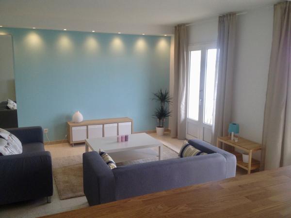 L'appartement est entièrement meublé et équipé. Grande chambre avec placard intégré, lit, bureau, table de chevet... 2 salles d’eau et 2 wc pour éviter les embouteillages ;-) 1 grand salon avec 2 canapés 1 grande cuisine avec 2 grands frigo congélateur, four, plaques à induction... 1 grand balcon Bref, tout est grand puisque l’appartement fait 130 m2. Il est traversant et très lumineux