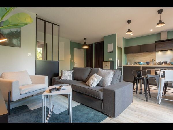 Le coin séjour chaleureux est équipé d’un canapé, d’une table basse et d’une télévision, abonnement Netflix inclus. L’appartement dispose d’une connexion internet via la fibre.