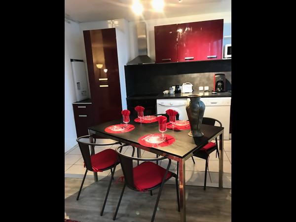 La cuisine entièrement équipée : four, réfrigérateur, congélateur, micro-onde, lave linge et lave vaisselle.