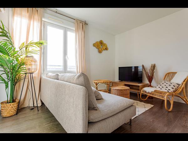 Il est entièrement meublé, équipé et il est refait avec goût. La cuisine est équipée d’un lave-vaisselle, d'une plaque vitrocéramique avec hotte, d’un frigo avec espace congélation, d’un micro-onde et d’un four. Il y également un espace buanderie avec machine à laver.