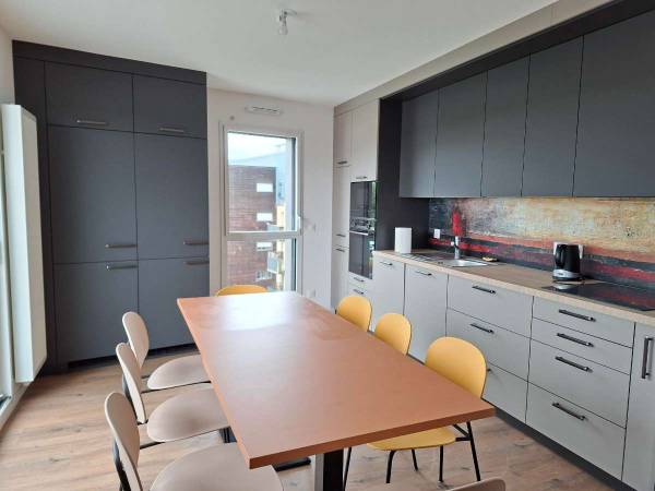 Appartement en colocation de 160 m² au dernier étage avec : - 7 chambres privées individuelles avec salle d'eau partagée entre 2 chambres et certaines avec terrasse privative - Un grand séjour cuisine salon ouvert : Une cuisine aménagée et équipée haut de gamme, équipée de tout le nécessaire avec frigos encastrés, lave vaisselle encastrée, micro-onde encastré, four, plaques Un salon confortable pour se détendre, une salle à manger pour des repas conviviaux entre colocataires. - Extérieur: terrasse sans vis à vis avec une grande table.