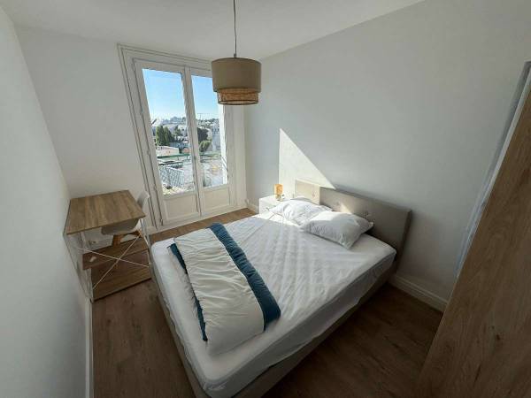 L’APPARTEMENT Un grand appartement refait à neuf, lumineux et entièrement meublé, situé rue Félix Lemoine à Nantes (proximité pont de la Tortière, proche des facultés) : Surface totale : +70 m² 4 chambres (entre 10 m² et 13 m²), décorées avec goût 1 séjour spacieux avec cuisine ouverte (25 m²) 2 salles de bain modernes (dont 1 privative pour une chambre) 1 WC indépendant Appartement entièrement équipé : électroménager, vaisselle, TV, Wi-Fi, etc. Stationnement gratuit à proximité 1 cave Accès local vélo