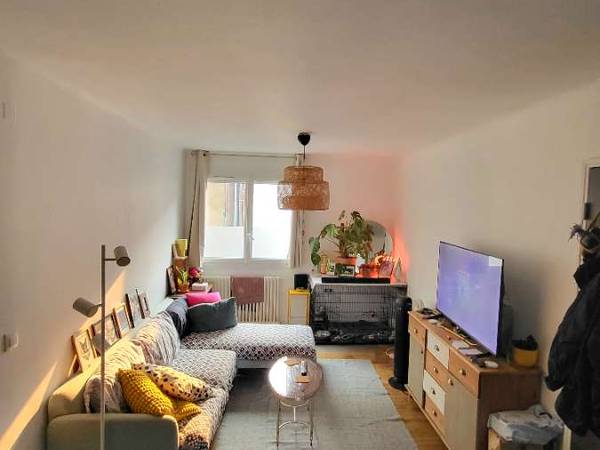 L'appartement fait 60m2 sans compter la cave, la chambre qui se libère fait environ 10m2 avec des grands placards et vue sur des jardins derrière. Je viens d'en refaire les peintures ainsi que de la munir de literie neuve. La cuisine est équipée d'un frigo, d'un four, d'un lave-vaisselle ainsi que d'un petit congélateur, d'une machine à laver et d'un sèche-linge dans la cave. Le loyer demandé toutes charges incluses (énergie et internet) est d'environ 480euros, 400euros pour le loyer et environ 80euros de charges variables selon la consommation d'énergie (on est autour de 110/120e par mois à diviser par deux actuellement)