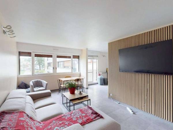 🛋️ Salon / salle à manger de 26 m² : Smart Tv (181cm), canapé (poltronesofà), etc ... La pièce de vie est entièrement meublée et conviviale, idéale pour partager des moments entre colocataires. Elle est bien lumineuse. Elle comprend un canapé, un fauteuil, une table basse, une table à manger avec chaises, une télévision ainsi que des espaces de rangement.