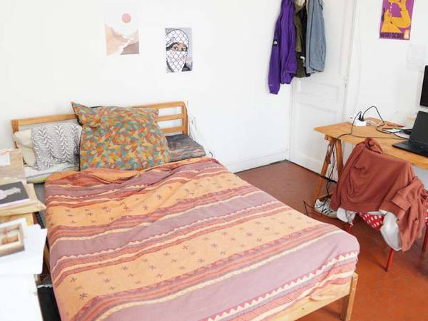 Chambre de 12m2, 2 grandes fenêtres, orientée Est donc on se réveille avec les rayons du soleil, le coloc qui part laisse un lit simple + fauteuil + étagère (entière liberté de la meubler à ta guise, on peut mettre le lit simple dans le salon et en faire un canap si tu veux amener ton lit double, etc.)