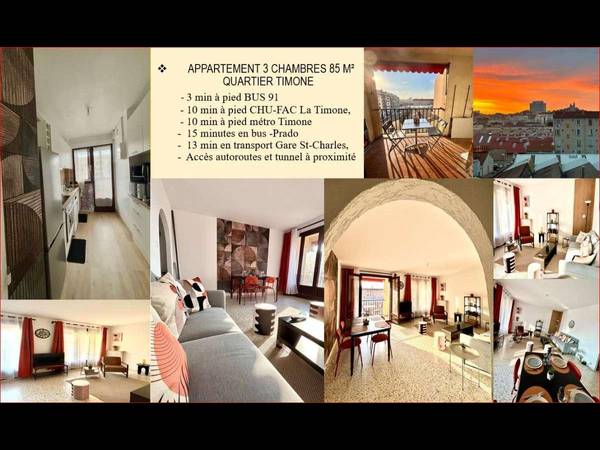 Mis en lumière par une décoratrice d’intérieur, l’appartement est situé au 4ème étage avec ascenseur, rue Gabriel Marie 10 eme arrondissement . Doté de 85m² + 10m² de balcon, l'appart est idéalement situé dans un quartier calme, à moins de 10 min à pied de l'hôpital de la Timone et des facultés de médecine, pharmacie, odontologie (Campus Santé Timone). Il se trouve à la sortie d'autoroute A50, proche du stade Vélodrome, des plages et du centre-ville et du bus lignes (18-72- 91, 518), métro Timone à 10 minutes, dans une rue au stationnement non payant.