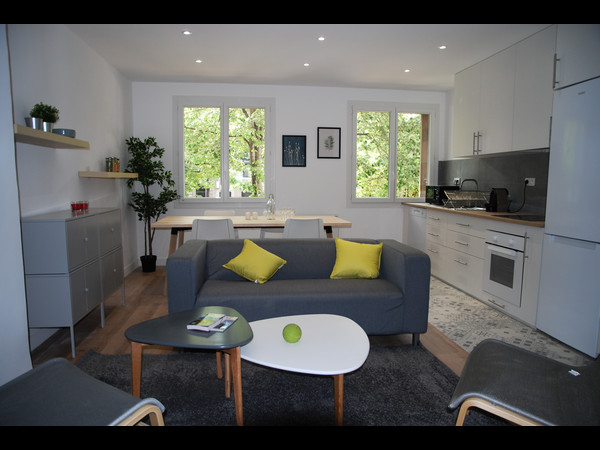 L'appartement comprend - 4 chambres avec double vitrage équipées d'un lit double, bureau, grand placard de rangement, étagère - une pièce de vie de 29 m2 comprenant une partie séjour et une partie cuisine. La cuisine est équipée d'un réfrigérateur/congélateur, plaques induction, micro-onde, lave-vaisselle, grille-pain, four, vaisselle et ustensiles de cuisine - 2 salles de douche et 2 WC indépendants - Lave-linge, aspirateur, table et fer à repasser