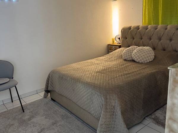 Chambre cosy, dans un appartement propre et tranquille, salle de bain avec baignoire, salon très spacieux avec canapé convertible, serviette des bains et linge de lit existant sur place , lit double avec matelas neuf ( forme de mémoire) , grande terrasse qui donne sur une cour verdoyante, 2eme étage. À deux pas tout le transport, autoroute, commerce et resto . Je cherche des colocataires zen et ordonné . La mer a 10 min en transport en commun !