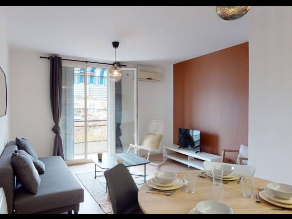 Composition du logement 3 chambres meublées, dont une avec salle d'eau privative Séjour lumineux, meublé et décoré avec goût Cuisine ouverte entièrement équipée : réfrigérateur, congélateur, four, micro-ondes, plaques vitrocéramiques, hotte, rangements, vaisselle et ustensiles, table et chaises Une salle d'eau WC indépendant Balcon filant accessible depuis deux chambres