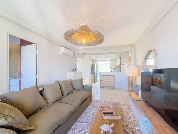 Un séjour lumineux et convivial Découvrez un appartement spacieux et moderne de 90 m², baigné de lumière naturelle. Le canapé 5 places, généreux et confortable, invite à la détente. Face à vous, un grand écran 4K Google TV vous promet des soirées cinéma inoubliables, sublimées par un éclairage chaud ajustable pour une ambiance sur-mesure. La décoration épurée associe modernité et naturel, avec une table basse en poutre de chêne pour une touche authentique.