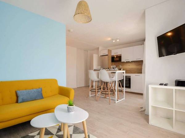 🍽️ Espaces communs haut de gamme Cuisine ouverte sur le séjour, lumineuse et entièrement équipée : * Réfrigérateur + congélateur * Four, micro-ondes, plaque induction * Lave-vaisselle * Machine à café, grille-pain * Vaisselle et ustensiles complets Salon convivial : * Canapé confortable * Table basse * Meuble TV + Smart TV (Netflix OFFERT) * Table haute * Accès balcon Buanderie dédiée : * Lave-linge * Sèche-linge