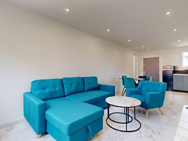 🏠 L’APPARTEMENT 🏠 Notre logement comprend : Un séjour avec une grande table à manger ainsi que quatre chaises. Un grand salon lumineux composé d'un canapé d'angle, un fauteuil ainsi qu'un meuble TV incluant une télévision à écran plat. Une table basse est aussi présente dans le salon. Une cuisine équipée d'un réfrigérateur, un micro-ondes, un lave-linge, une plaque de cuisson à induction et de nombreux rangements. Les deux chambres disposent d'un lit double, un bureau avec une chaise. Vous y trouverez aussi un grand placard à rangement ainsi qu'une table de nuit. La salle d'eau dispose d'un WC fermé, une douche ainsi qu'un meuble vasque avec miroir.