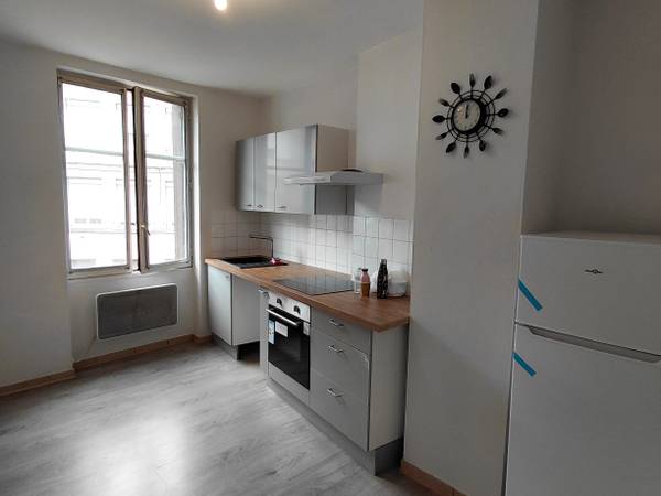 Composition : - Cuisine moderne équipée avec électroménager entièrement neuf et ustensiles de cuisine - Salle de bain entièrement refaite à neuf avec douche et toilettes dans la même pièce - Salon meublé (canapé convertible, meuble TV, table basse, et 2 chaises) - Pièce supplémentaire pouvant servir de bureau, de dressing ou de chambre : idéal pour 1 ou 2 personnes, étudiants ou petite famille - Table et étagère de rangement en cours d’installation - Eau chaude par cumulus, chauffage individuel électrique