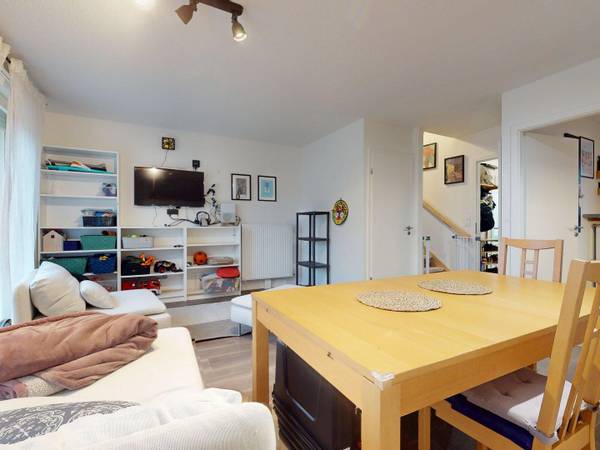 🏠 LE LOGEMENT La pièce de vie, baignée de lumière naturelle, s’ouvre directement sur le jardin. Elle est meublée avec un canapé, des fauteuils, une bibliothèque, un grand placard de rangement ainsi qu’une table à manger pour vos moments conviviaux en famille ou entre amis. La cuisine est équipée d’un four, de plaques de cuisson, d’une hotte, d’un évier, d’un réfrigérateur avec compartiment congélateur, ainsi que de nombreux rangements et ustensiles de cuisine (dont un grille-pain). Une première salle de bain se situe au rez-de-chaussée, avec douche, meuble vasque et WC intégré. À l’étage, vous trouverez les trois chambres : La chambre parentale (13 m²) avec lit double, télévision et placard. Une seconde chambre, équipée d’un lit simple, d’une étagère et d’une armoire. La troisième chambre, aménagée avec un bureau et des étagères. Elle peut être transformée selon vos besoins : chambre d’amis ou espace de travail. Une deuxième salle de bain, avec baignoire, est également disponible à l’étage. Une machine à laver est mise à disposition pour votre confort.
