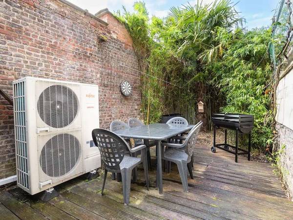 Le logement de 153m2 comporte 6 chambres et est équipé de 4 douches et 5 WC. Il y a une grande cuisine et un grand salon donnant sur un petit jardin à l’ombre des briques recouvertes de lierre et de grands bambous.