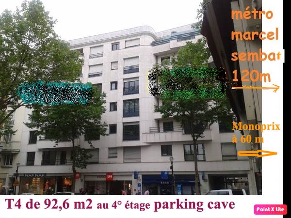 Bel appartement bail meublé ou quasi vide, traversant, 4 P. 3 ch. standing, parking, cave, métro Marcel Sembat à Boulogne Billancourt Bd J. Jaurès, de 92,6 m2, parfait état, immeuble standing de 1996, au 4° étage sur 6, avec ascenseur, entrées sécurisées, Diagnostics du 29/10/25 DPE B et C ; composé de : entrée-hall, séjour exposé sud-ouest, petit balcon au sud-ouest devant cuisine et séjour; 3 chambres penderies placards ( ou 2 ch & 1 bureau); 2 salles de douches et 2 wc, couloirs dégagements, cuisine aménagée et bien équipée (réfrig-congelat, laves linge & vaisselle, four, plaque induction, placards divers ). Chauffage par radiateurs radiants électriques récents, eau chaude par cumulus électriques, double vitrages, carrelages pièces d'eau et parquet chêne massif sur couche liège isolante, Inter-visio-phone, 1 place de parking au – 3, accès direct depuis ascenseur, une grande cave au -3. Caution solidaire ou garanties sollicitées. Eau incluse dans charges. de 250 €/mois ; Libre de suite ; Renseignements 7j/7j de 9 à 22 H visites sous condition de communiquer photo de CNI ou passeport.