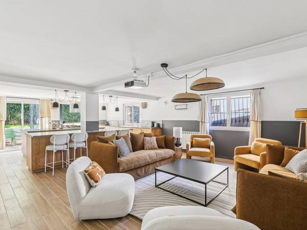 Les espaces communs sont confortables : une cuisine ouverte sur une belle salle à manger, une véranda, un salon, une terrasse, un jardin et une buanderie.