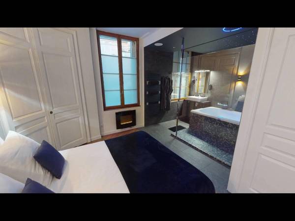 L’appartement se compose : D’une chambre avec sa cheminée électrique De deux magnifiques placards d’époque D'un salon avec mobilier contemporain et grand écran de télévision, D’une cuisine aménagée et équipée ouverte sur le séjour, dotée de tout le confort : four micro-ondes, réfrigérateur, lave-vaisselle, machine Nespresso, bouilloire, grille-pain... D’une salle de bain dotée d’un lavabo, d’une baignoire spa et d’une douche à l’italienne D’un espace buanderie avec un lave-linge et un sèche-linge D’un water-closet.