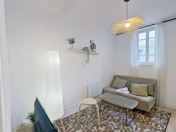🛋️ LE LOGEMENT Ce T2 s’ouvre sur un séjour lumineux, meublé avec un canapé, une table basse, un meuble TV avec télévision, une lampe et un tapis. La cuisine est séparée et entièrement équipée pour votre confort : plaques de cuisson, évier, micro-ondes, réfrigérateur, rangements, plan bar avec tabourets. Le plus : bouilloire, machine à café, grille-pain, ustensiles de cuisine à votre disposition pour plus de praticité ! La salle d’eau comprend une douche ainsi qu’un meuble vasque avec miroir. La chambre est équipée d’un lit double, d’une table de chevet et d’espaces de rangement. Les WC sont séparés et sont accessibles depuis la chambre.