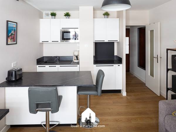 Studio entièrement rénové par un architecte et situé au 6ème étage avec ascenseur d’une copropriété des années 70, en plein cœur du quartier Longchamp. L'appartement se compose de plusieurs espaces bien aménag□□s : Une pièce principale comprenant un canapé convertible, une table basse, des luminaires, une TV LCD, et un coin bureau. Une cuisine ouverte avec un îlot central entièrement équipée. Elle dispose d'un plan de travail en pierre imitation marbre noir, de tabourets de bar, d'un frigo table top, de plaques de cuisson à induction, d'un micro-ondes, d'un lave-linge séchant, d'une bouilloire, d'une cafetière et d'un grille-pain. Une salle d'eau avec une cabine de douche, une vasque, des WC et un sèche serviettes. Un balcon équipé de mobilier de jardin. Abonnement internet fibre souscrit par le propriétaire, possibilité de refacturation sur compte locataire sur demande en bail. Commerces et transports à proximité (métro Chartreux 300m à pied). BUS : 42 - 42T Saint Just Ivaldi METRO : M1 Chartreux