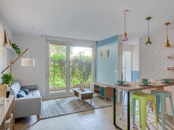 Appartement T5 en RDC avec terrasse (donnant sur un jardin de la copropriété), refait à neuf et entièrement meublé par une architecte d'intérieur. Il se situe rue Jean Vallier à 5mn à pied du métro Debourg.