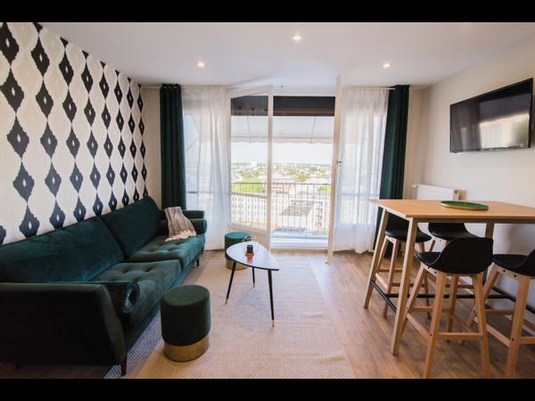 -1 salon avec TV, grand canapé, table bar et ses chaises