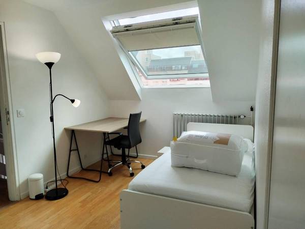 Chambre d'étudiant.e meublée comprenant lit simple, bureau, chaise et lampe de bureau, placard,