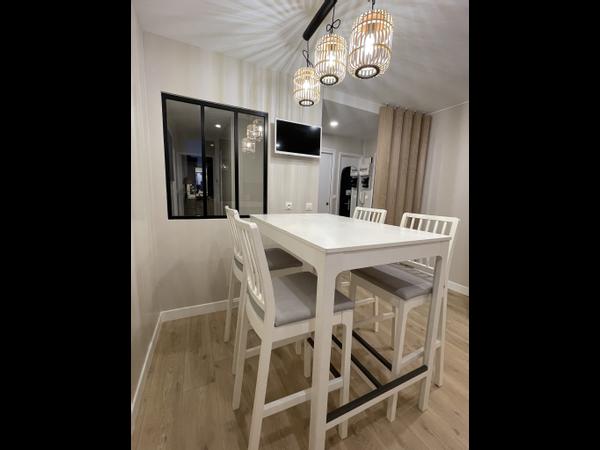 chaises hautes de bar , est entièrement équipée avec : 1 réfrigérateur xxl, lave-vaisselle, lave-linge séchant , four, table de cuisson induction, Nespresso, bouilloire, four à micro-onde, placards avec vaisselle et ensemble des ustensiles de cuisine.