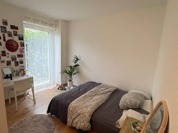 La chambre : - Chambre lumineuse - Salle de bain privée dans la chambre - Rangements qui seront libérés pour toi - Chambre non-fumeur - Petit accès extérieur via une porte vitrée