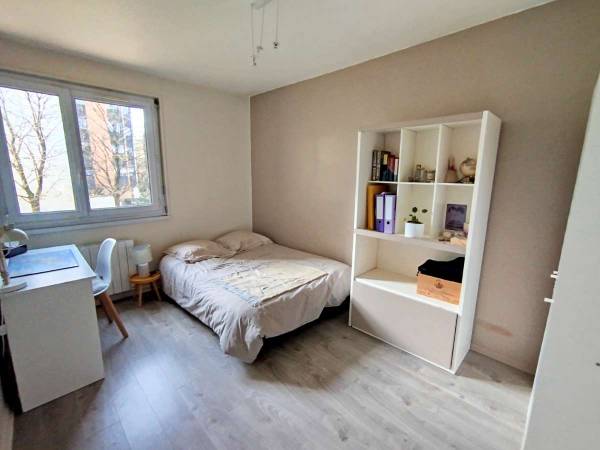 Descriptif de la chambre : Meublée : lit double, placard, étagère, bureau, chaise, table de nuit Store extérieur très occultant