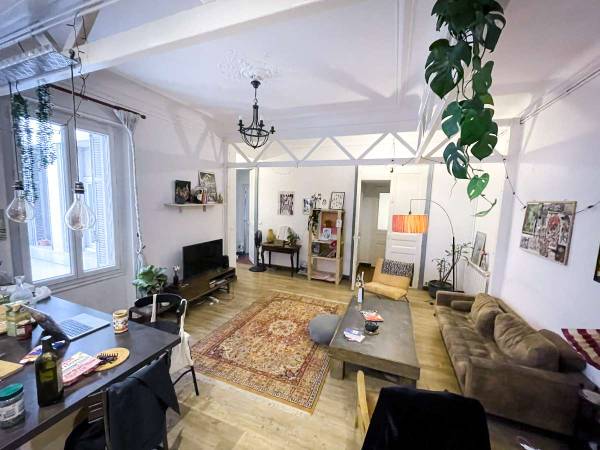 L'appartement est très spacieux, il possède un grand salon avec une cuisine ouverte, une entrée et deux salles de bains qu'on se partage. La chambre quand à elle fait 18m2, coté rue, avec un petit balcon.